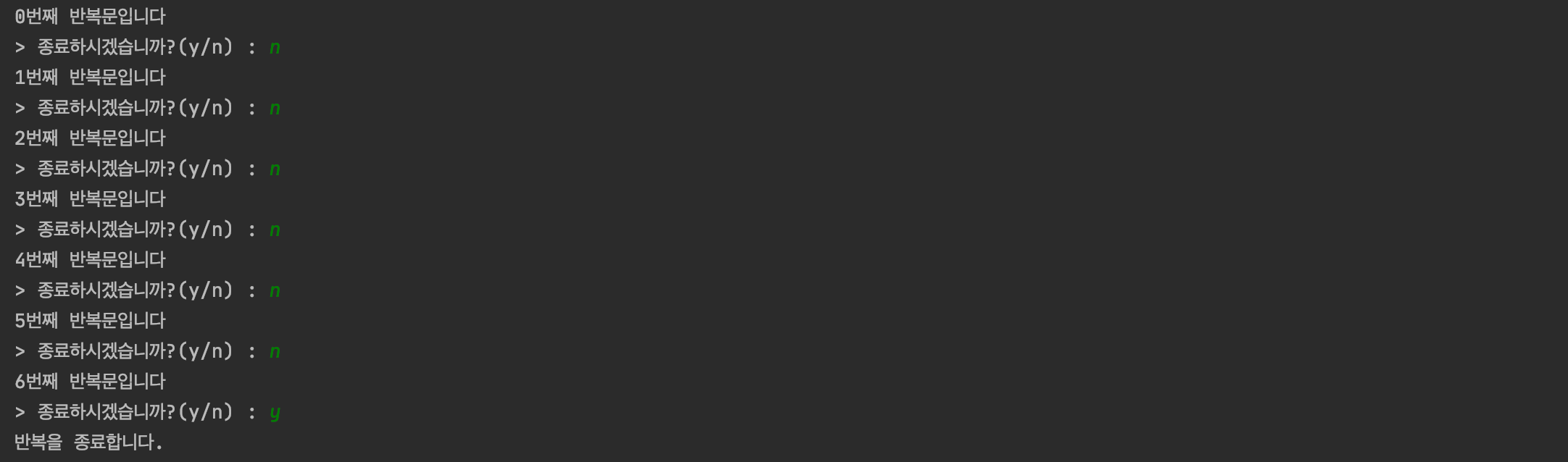 위 처럼 while 반복문은 조건이 필요할 때, 혹은 무한 반복을 구현하려고 할 때, for 반복문 대신 사용됩니다.