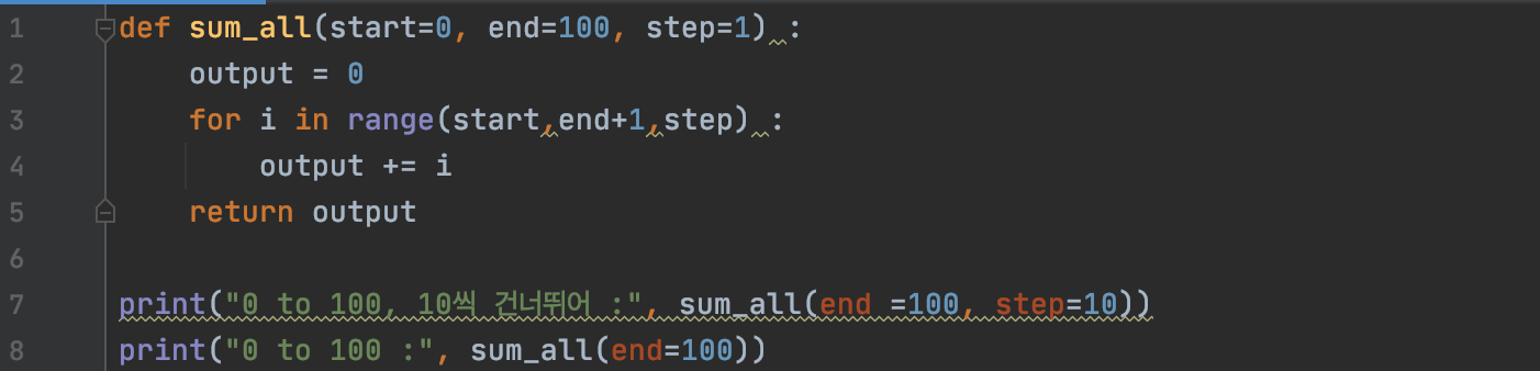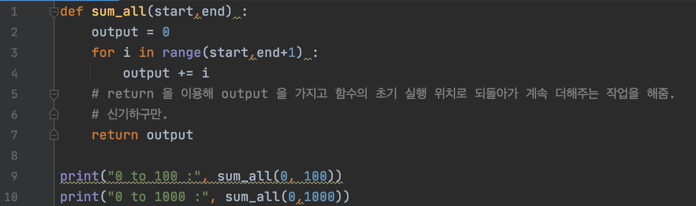 예제를 통해 이해하는 것이 더 쉬운데, 범위 내의 모든 정수를 모두 더하는 함수를 return과 for 반복문을 이용해 만들어볼게요.