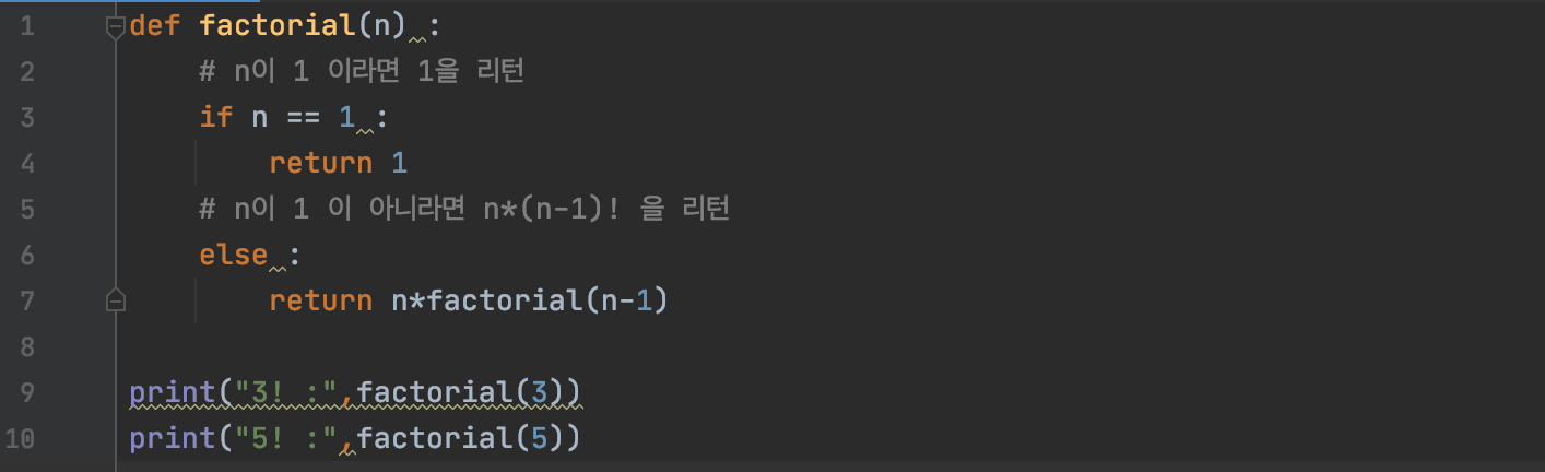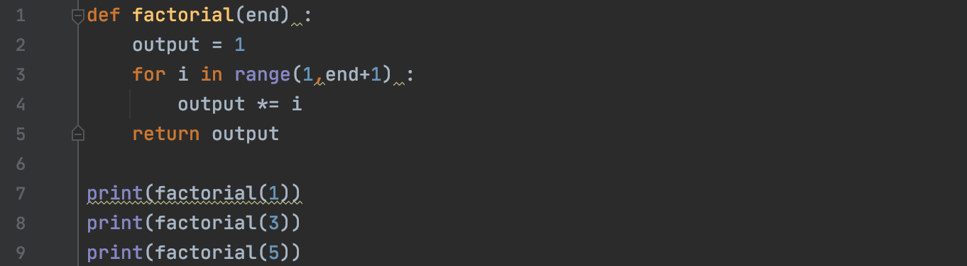 이를 활용하면, 팩토리얼 함수도 만들 수 있습니다. += 를 *= 으로 바꿔주고 range 의 시작 범위를 1로 정해주면 됩니다!