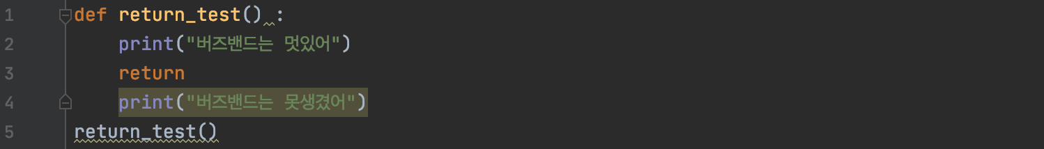 위의 입력 화면을 보시면 return 이라는 키워드가 아래의 print("버즈밴드는 못생겼어") 의 출력을 막아줍니다.