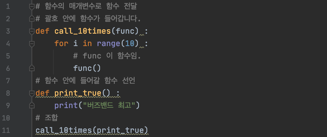 위에서 확인할 수 있듯이, call_10times 라는 함수에 print_true 라는 함수를 전달해, 함수와 함수의 조합을 확인할 수 있었습니다.