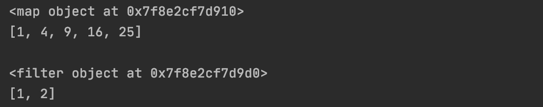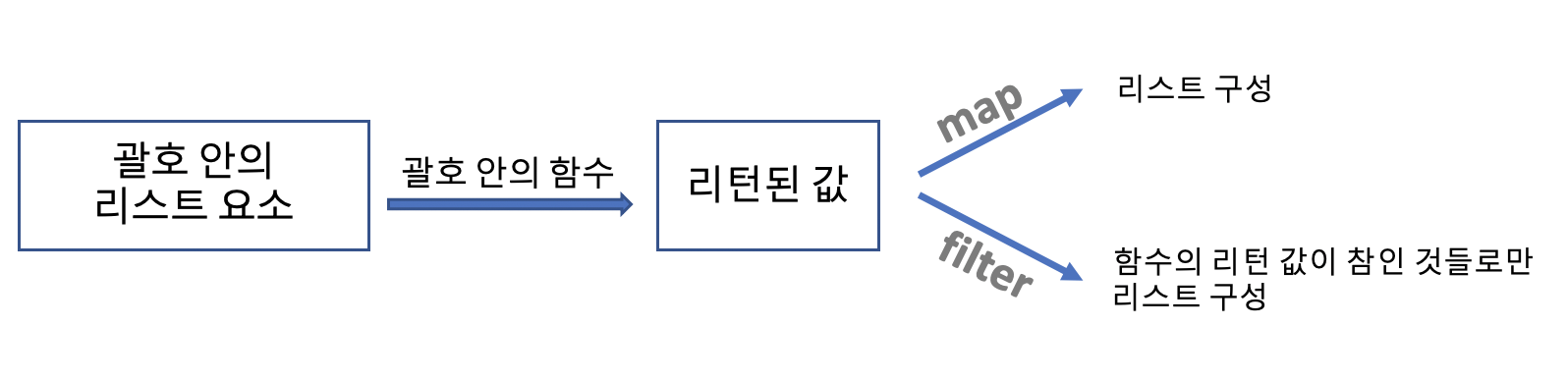 그 출력된 값을 요소로 가지는 리스트를 만들어주는 것이 map, 그리고 출력된 값이 참인 요소들만 리스트로 만들어주는 것이 filter 입니다.