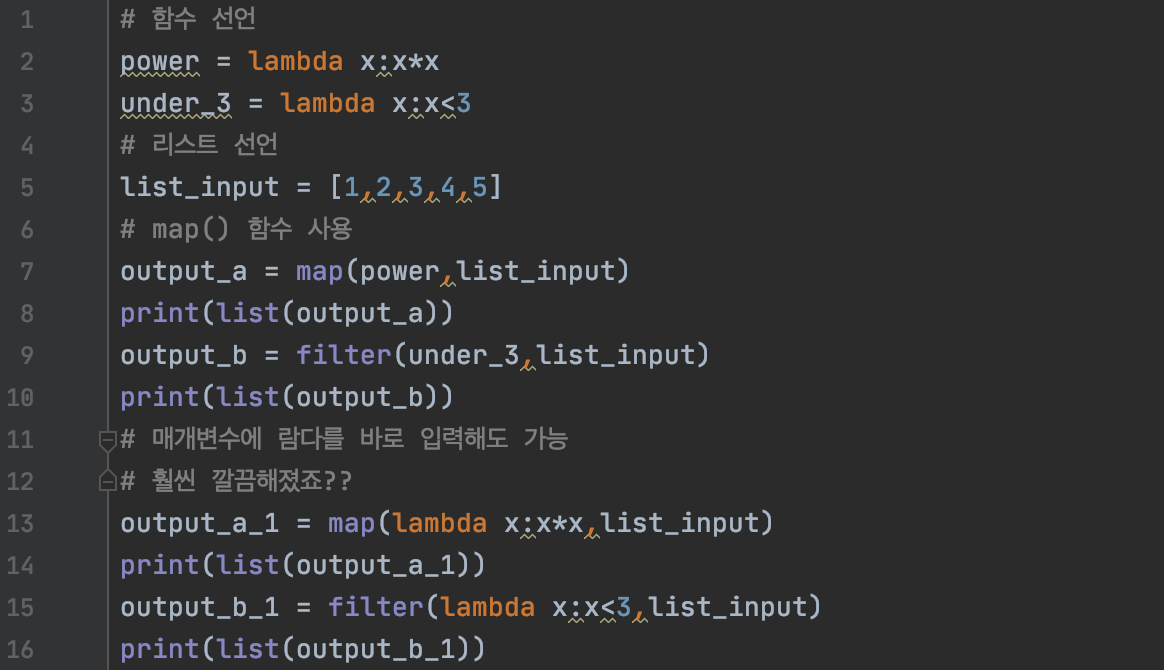 합성함수 처럼 map, filter 보다 괄호 안의 함수가 먼저 괄호 안 리스트의 요소를 입력값으로 출력해주고,