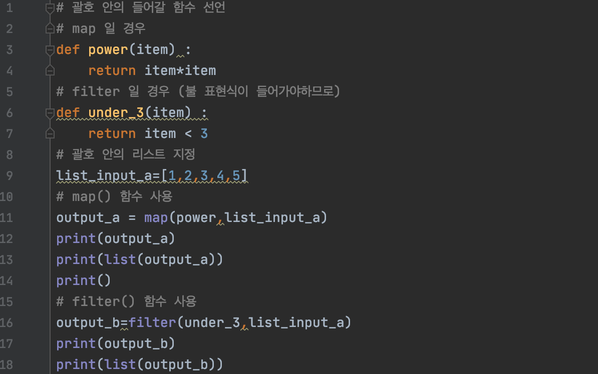 그 출력된 값을 요소로 가지는 리스트를 만들어주는 것이 map, 그리고 출력된 값이 참인 요소들만 리스트로 만들어주는 것이 filter 입니다.