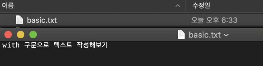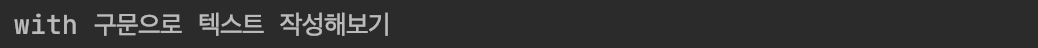 아까 text 파일에 입력한 "with 구문으로 텍스트 작성해보기" 가 출력되어 나온 것을 확인할 수 있습니다.