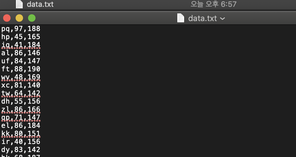 위와 같이 한 줄에 하나의 데이터를 나타내며, 각각의 줄에서는 쉼표를 사용해 데이터를 구분해서 입력합니다.