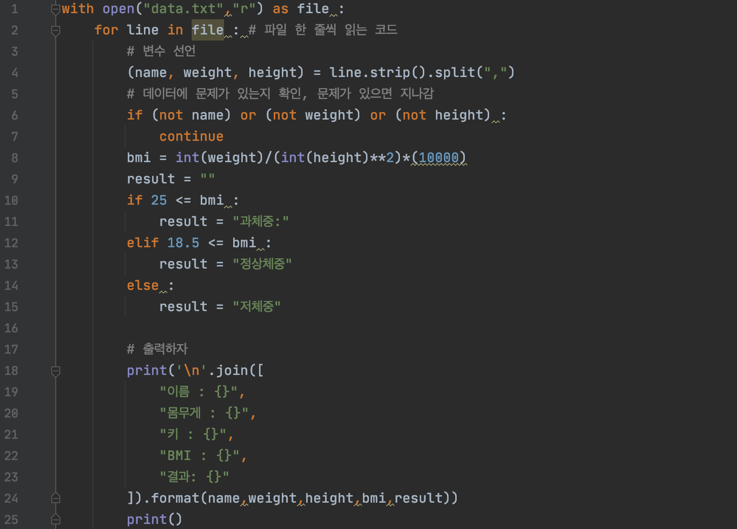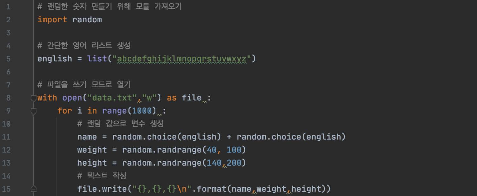 예시로, 1000명의 이름, 키, 몸무게 데이터를 가진 파일을 만들고 파일을 한 줄씩 읽어 들여 처리하는 방법을 알아볼게요!