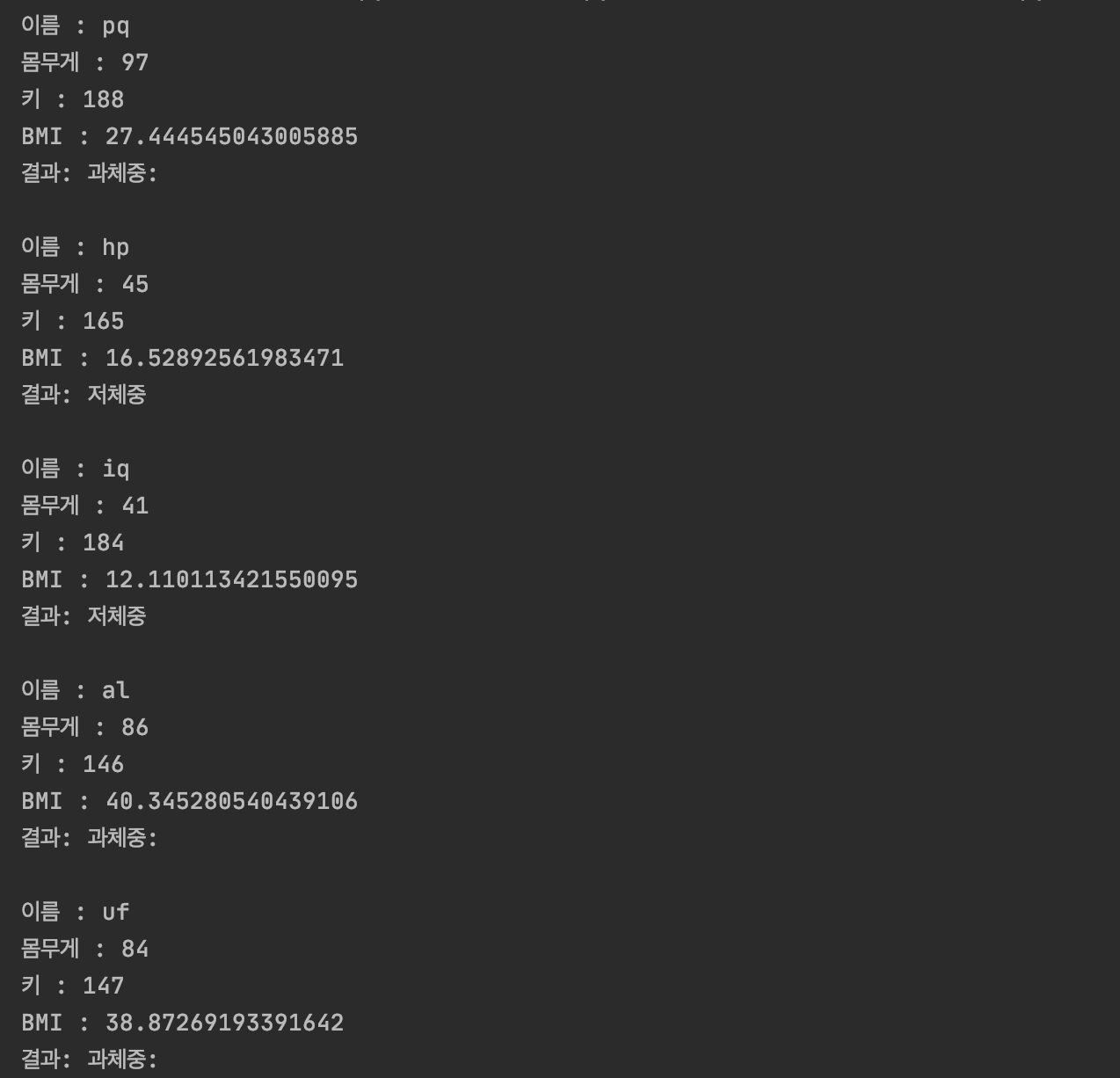 위의 코드를 사용해서, 키와 몸무게로 BMI 도 계산해봅시다!