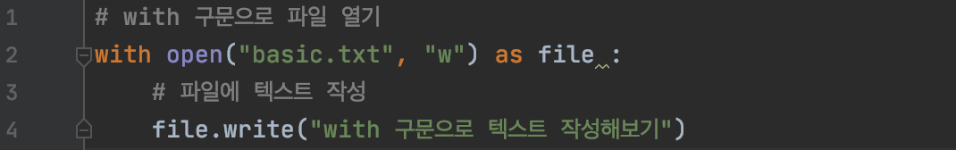 with 키워드를 통해 함수를 코드를 작성하면, with 구문 부분이 종료될 때 자동으로 파일이 닫힙니다.