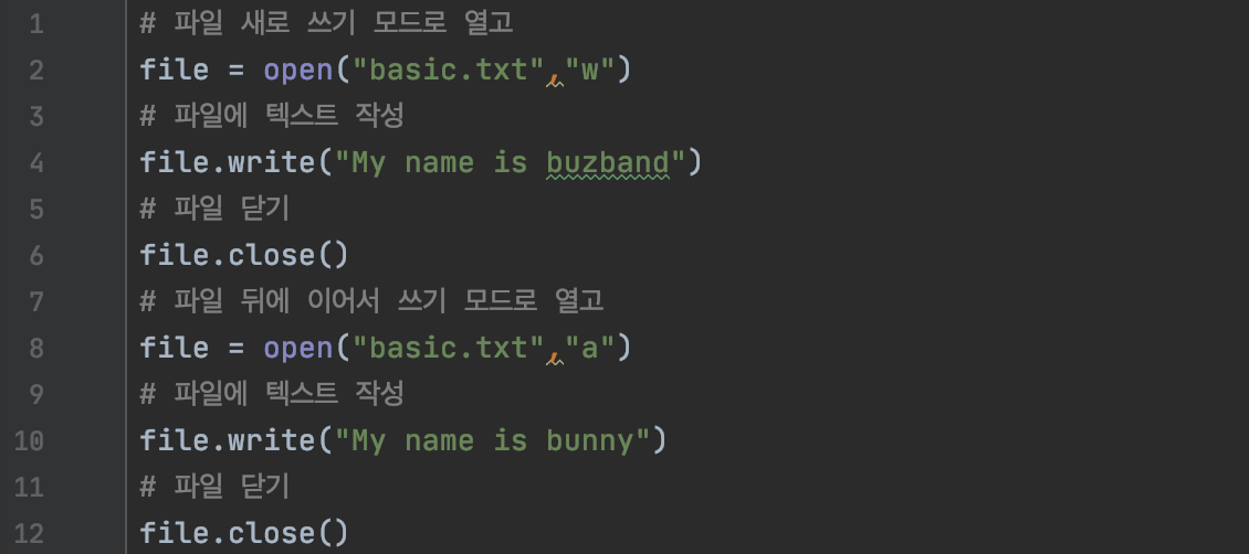 | a | append 모드 (뒤에 이어서 쓰기 모드) |