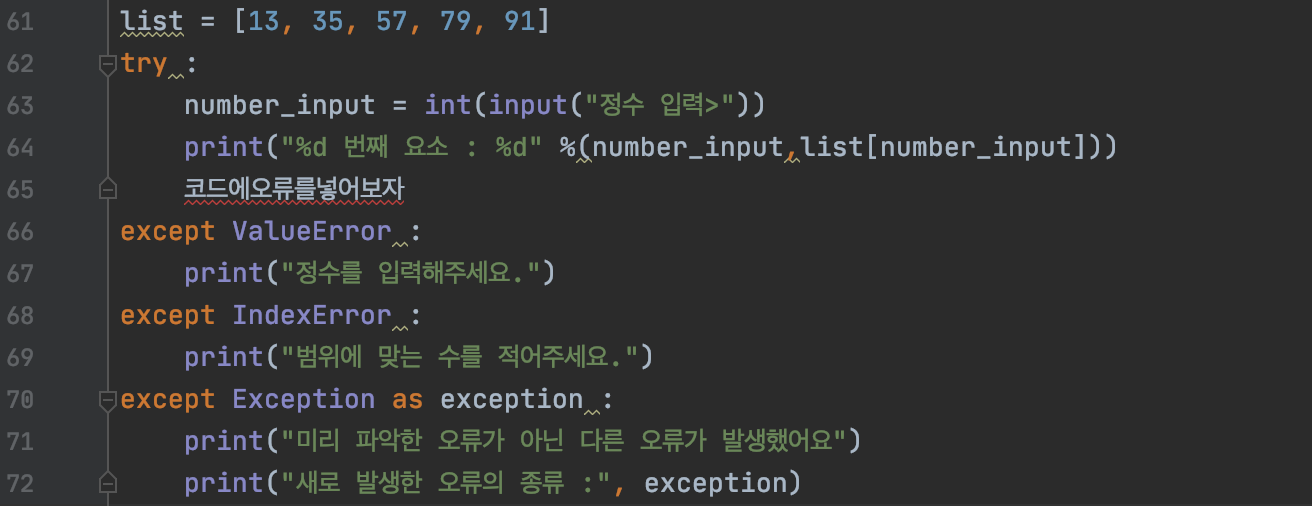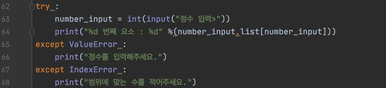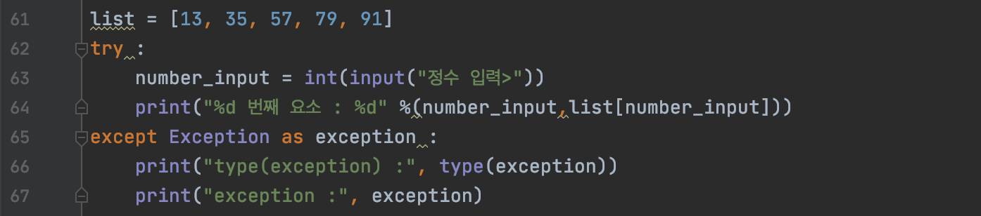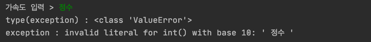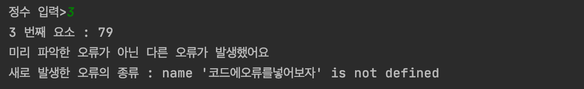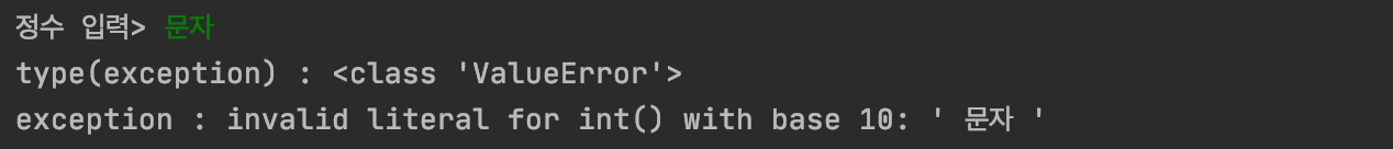 위의 실행된 코드 화면을 보면 정수를 입력함으로서 생기는 오류의 종류, 즉 '예외 객체의 자료형'은 'ValueError" 라는 것을 알 수 있고,
